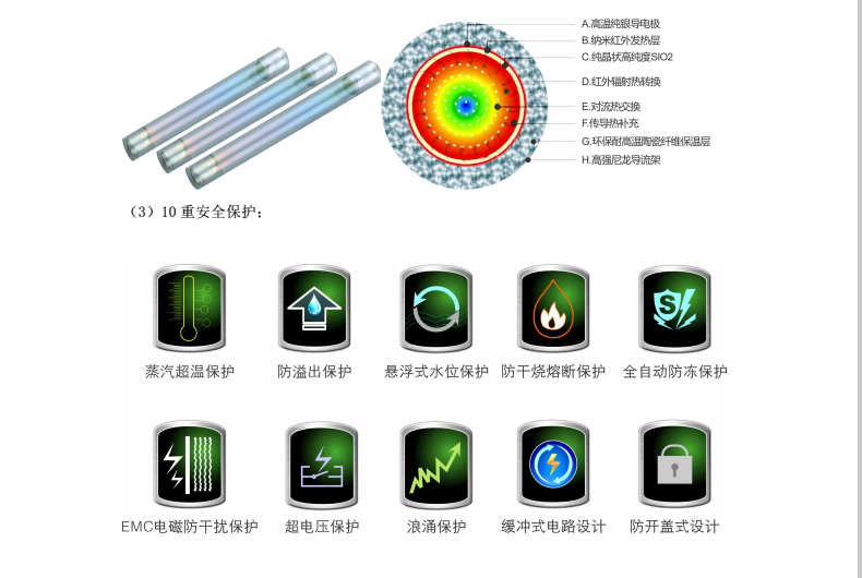 (4)10重安全保護:防蒸汽超溫、溢出、干燒、沖擊、防凍、超電壓、浪涌、電磁干擾、開蓋式設計及懸浮式水位保護;