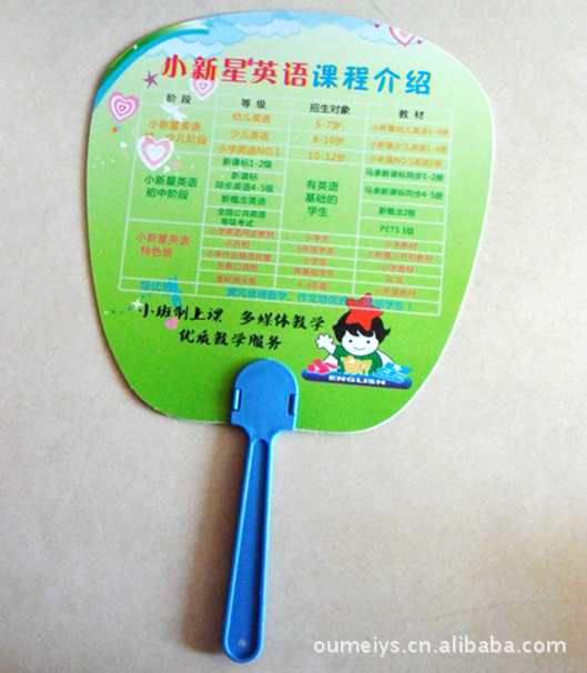 產品特點:中長柄扇,手桿寬厚、牢固高檔典雅,廣告幅面大、印刷色彩艷麗、宣傳效果持久,針對性強、價格便宜、經濟實惠等特點,能很好的為商家做有針對性的廣告宣傳;其外形、規格、顏色等均可按商家的具體要求特別制定。