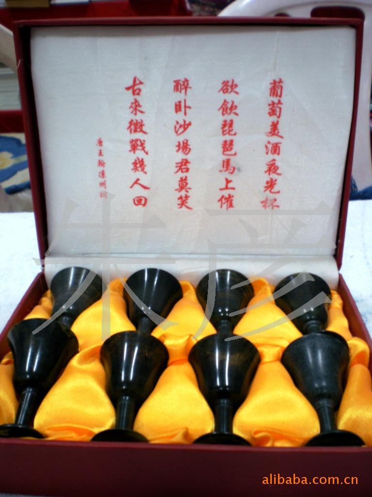 據西漢東方朔《海內十洲記》載:周穆王姬滿應西王母之邀赴瑤池盛會,席間,西王母饋贈姬滿一只碧光粼粼的酒杯,名曰"夜光常滿杯"。周穆王如獲至寶,愛不釋手,從此夜光杯名揚千古。 夜光杯質地光潔,色澤斑斕,宛如翡翠,倒入美酒,酒色晶瑩澄碧。尤其皓月映射,清澈的玉液透過薄如蛋殼的杯壁熠熠發光。唐人王翰詩云"葡萄美酒夜光杯",詩以杯出名,杯因詩增輝。王瀚的這句詩一語道破天機,所謂紅粉配佳人,寶劍贈英雄,葡萄美酒當然要用夜光杯來品嘗了!