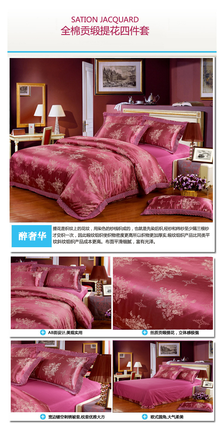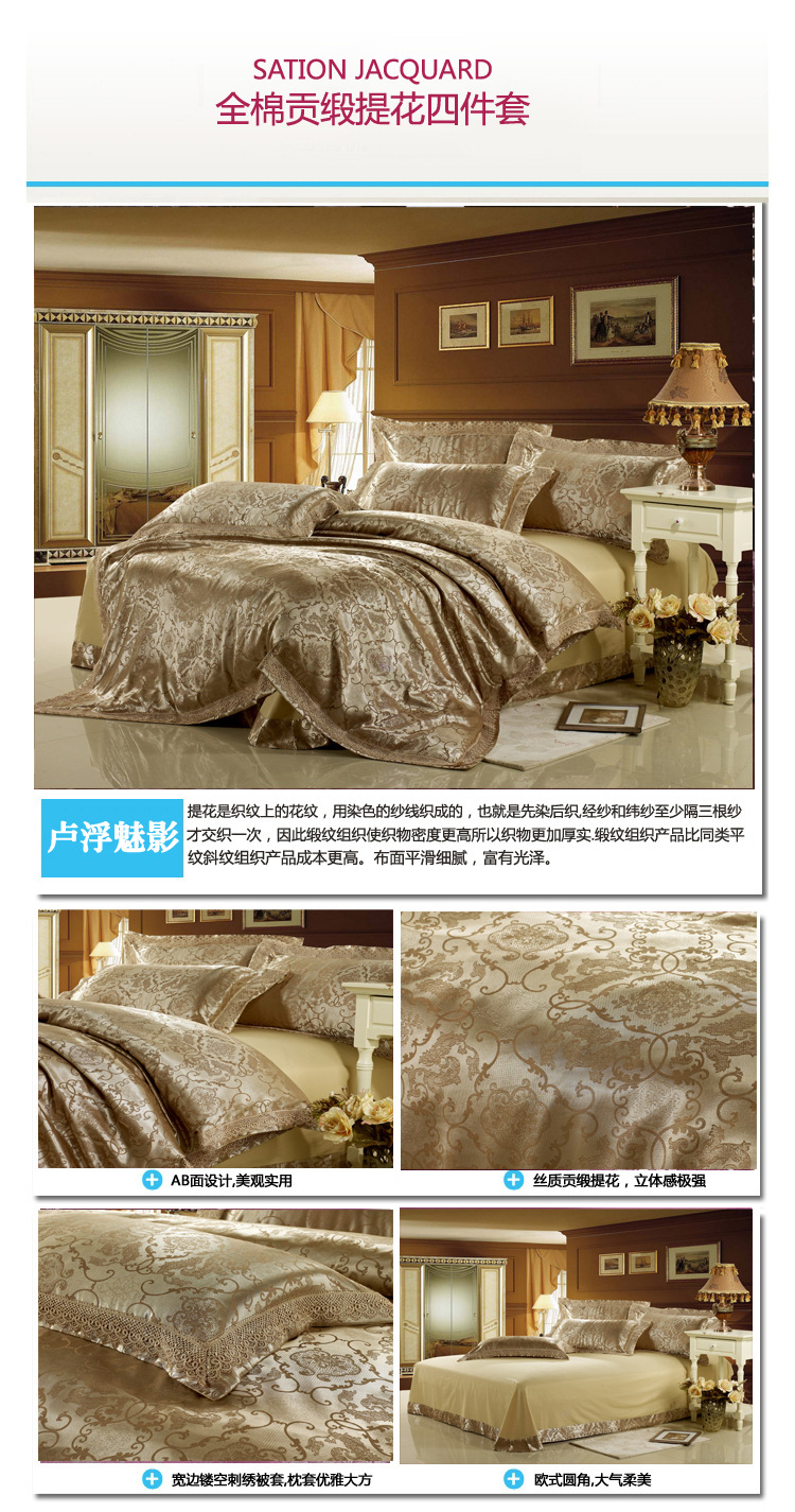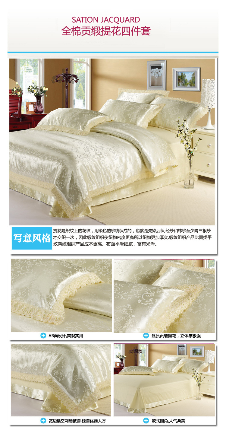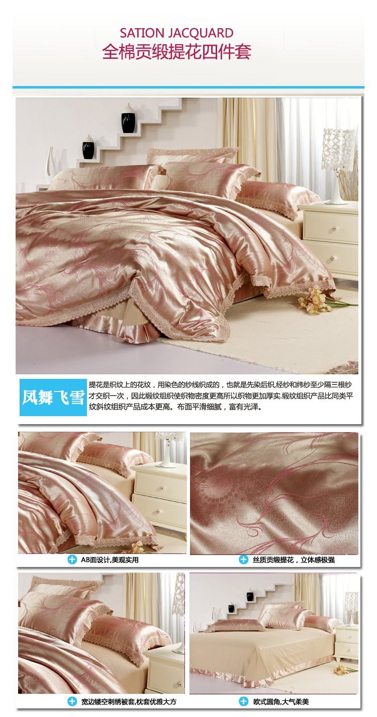 品 牌羅萊家紡商 品 名 稱貢緞提花四件套規 格1.5床:被套200x230cm,床單250x250cm,枕套48x74cm規 格1.8床:被套220x240cm,床單250x270cm,枕套48x74cm產品成分含量100%棉,40S/133*72產 品 重 量產品執行標準GB/T 22844-2009產 品 等 級一等品洗 滌 說 明水洗水溫40度;不可氯漂;可干洗;中溫熨燙;請勿接觸銳器或用力撕拉,深色要分開洗滌溫 馨 提 示由于面料位子裁剪的原因,可能會造成枕套的花紋跟實物圖有所區別,如果特別在意枕套的花紋,請慎拍。