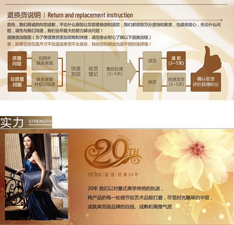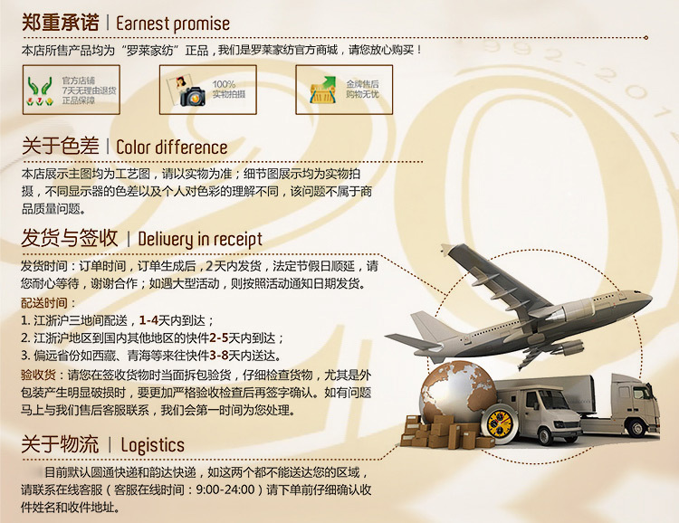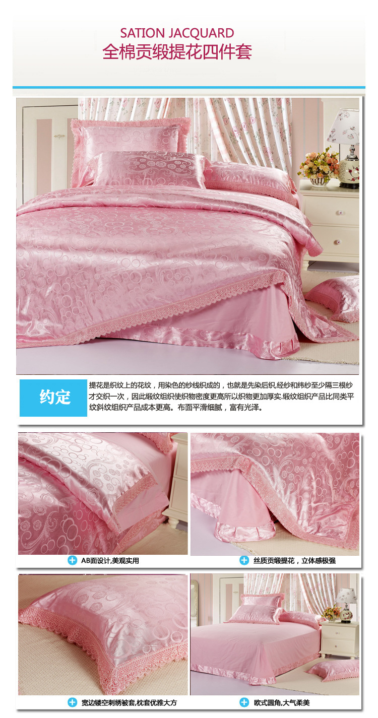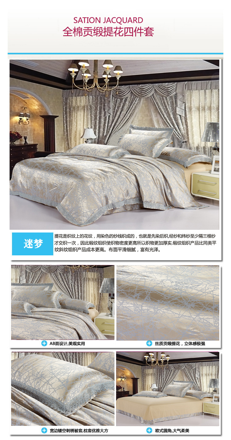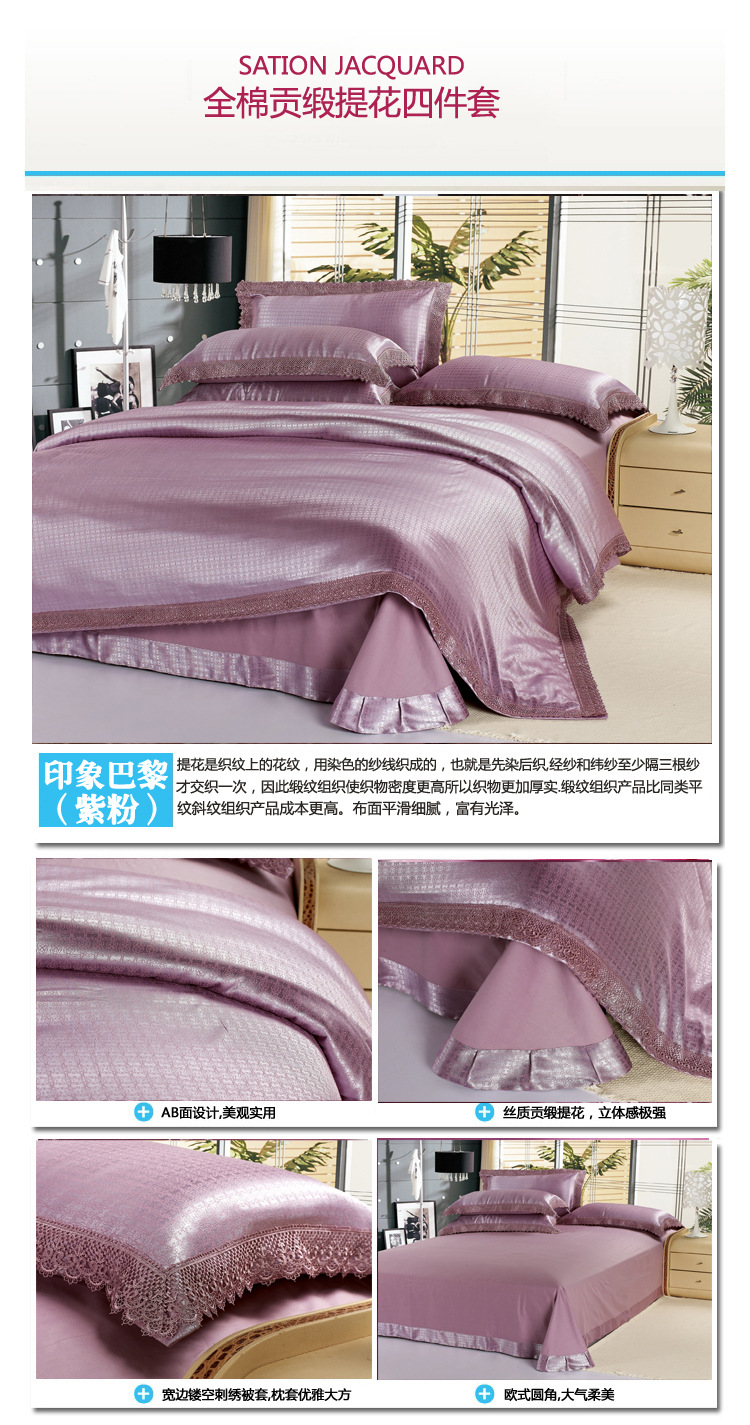 品 牌羅萊家紡商 品 名 稱貢緞提花四件套規 格1.5床:被套200x230cm,床單250x250cm,枕套48x74cm規 格1.8床:被套220x240cm,床單250x270cm,枕套48x74cm產品成分含量100%棉,40S/133*72產 品 重 量產品執行標準GB/T 22844-2009產 品 等 級一等品洗 滌 說 明水洗水溫40度;不可氯漂;可干洗;中溫熨燙;請勿接觸銳器或用力撕拉,深色要分開洗滌溫 馨 提 示由于面料位子裁剪的原因,可能會造成枕套的花紋跟實物圖有所區別,如果特別在意枕套的花紋,請慎拍。