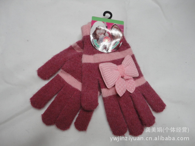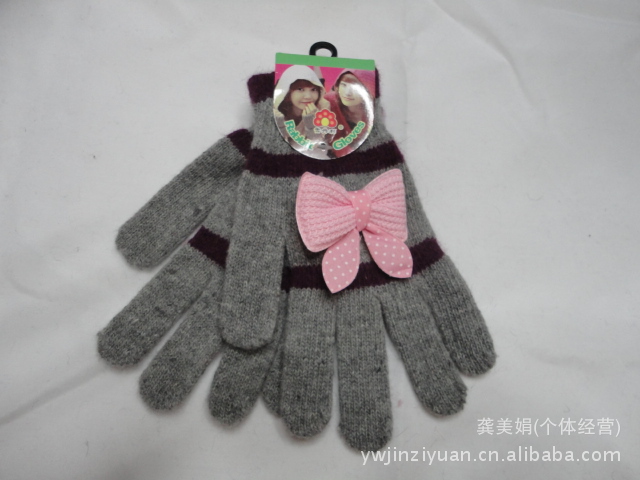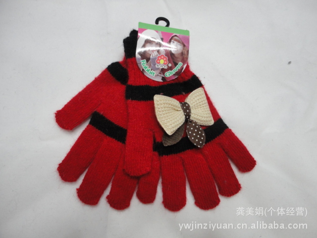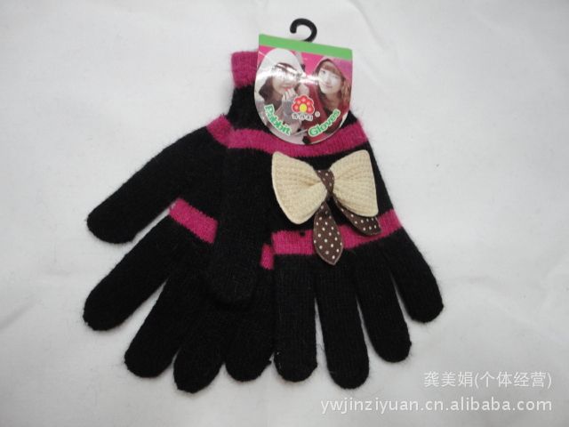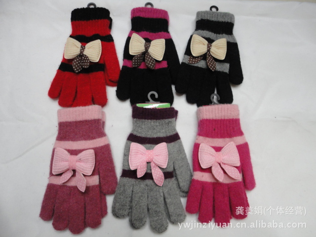 廠家直銷韓版時尚兔毛條紋帶蝴蝶結全指手套 針織手套 魔術手套