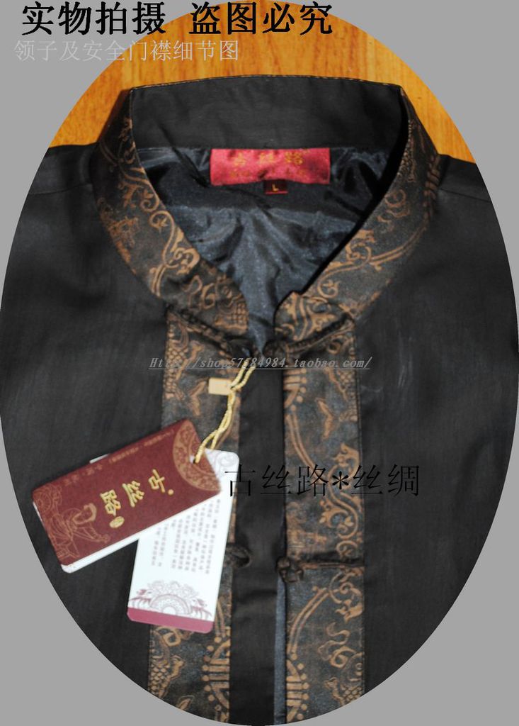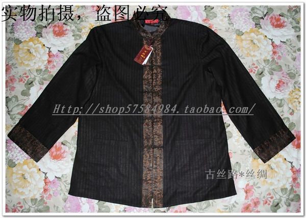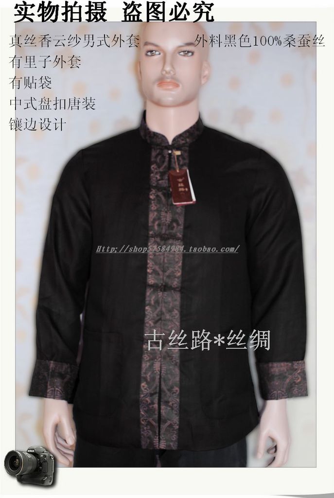 【面布】:真絲香云紗莨綢(100% SILK)---黑色鑲門襟唐裝(外套布料真絲香云紗--每批布料都會有點不同,隨機發貨)