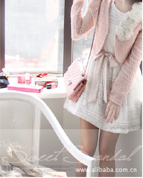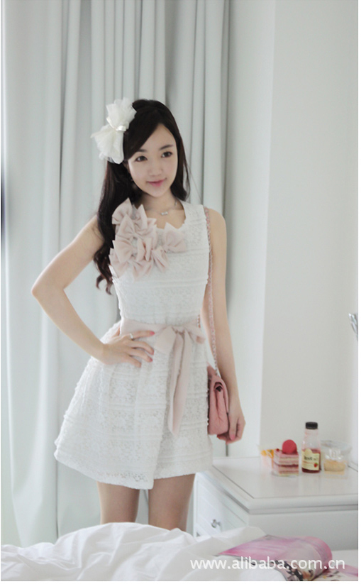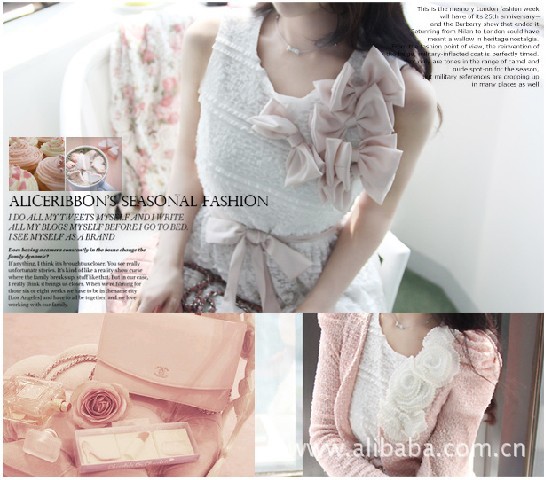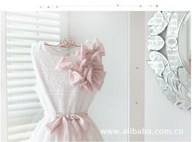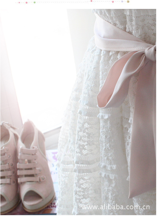 大大的蝴蝶結。嫩嫩的水粉.腰間還配上這么一條雪紡的腰帶。雪紡‘蕾絲‘兩者搭配。甜美的小女生。性感的小女人。都很適合呢。親們.穿上它.讓這個夏天更美好吧!