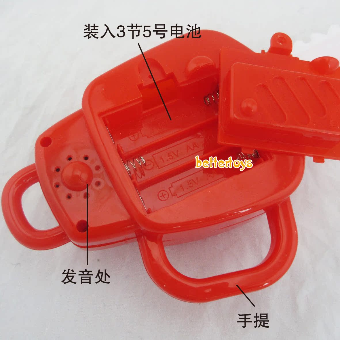 產品介紹:在電鋸的手柄處裝上3個5號電池(電池客戶自備或在本店購買) ,打開一個小小的黑色的開關,電鋸就會發出熊出沒的聲音(光頭強,熊大,站住,熊二,不許動),且帶有燈光的,是一款新款且熱賣中的產品)。