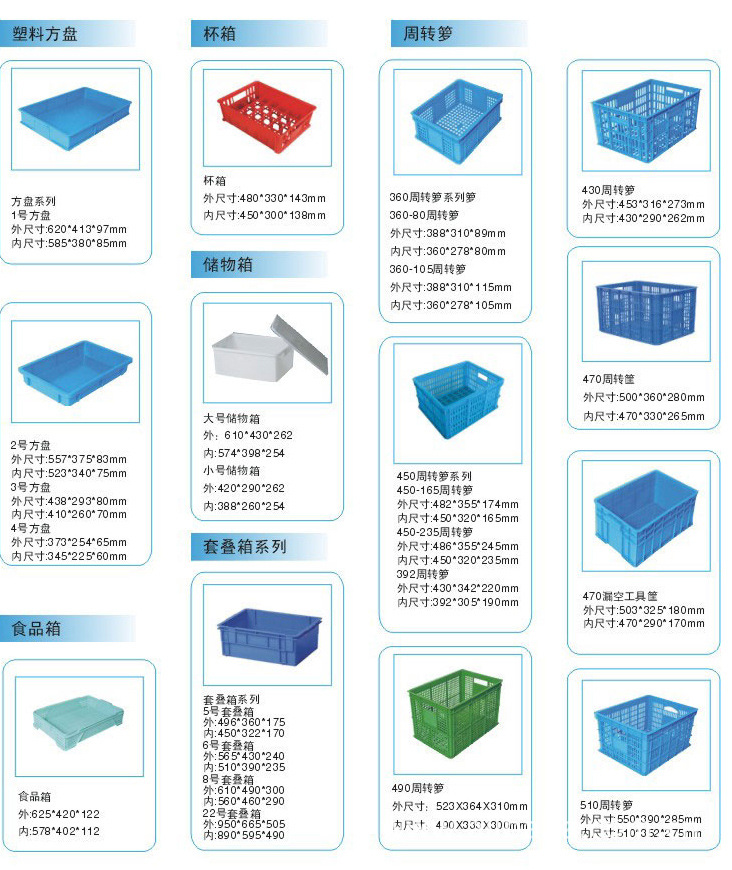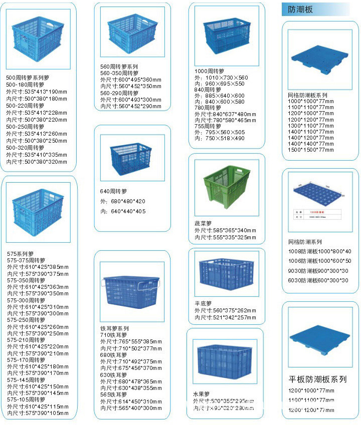 選擇塑料周轉箱注意事項:塑料周轉箱分網眼可疊、網眼可套、封閉可疊、封閉可套四種,適合倉庫、生產流水線、廠區內部周轉及運輸途中周轉使用??莎B型適合堆垛,可套型不適合堆垛,但是可套型在使用完畢后堆垛起來可以節省空間,節約運輸成本。網眼型只可以存放固體物品,封閉型即可存放固體物品也可以存放液體物品。通用塑料周轉箱,由于成型工藝條件關系,上口會略大于底部,因此有效內尺寸略小于實際內尺寸5~7mm斜插式塑料周轉箱,有效內尺寸根據堆放物品不同而異。在生產流水線的輸送帶上推薦使用平底無加強筋的塑料周轉箱,另可配有插卡(標簽卡、標簽袋),也可以配箱蓋,箱蓋通常分平蓋和翻蓋兩種,選用箱蓋后,長*寬*高會相應增加。