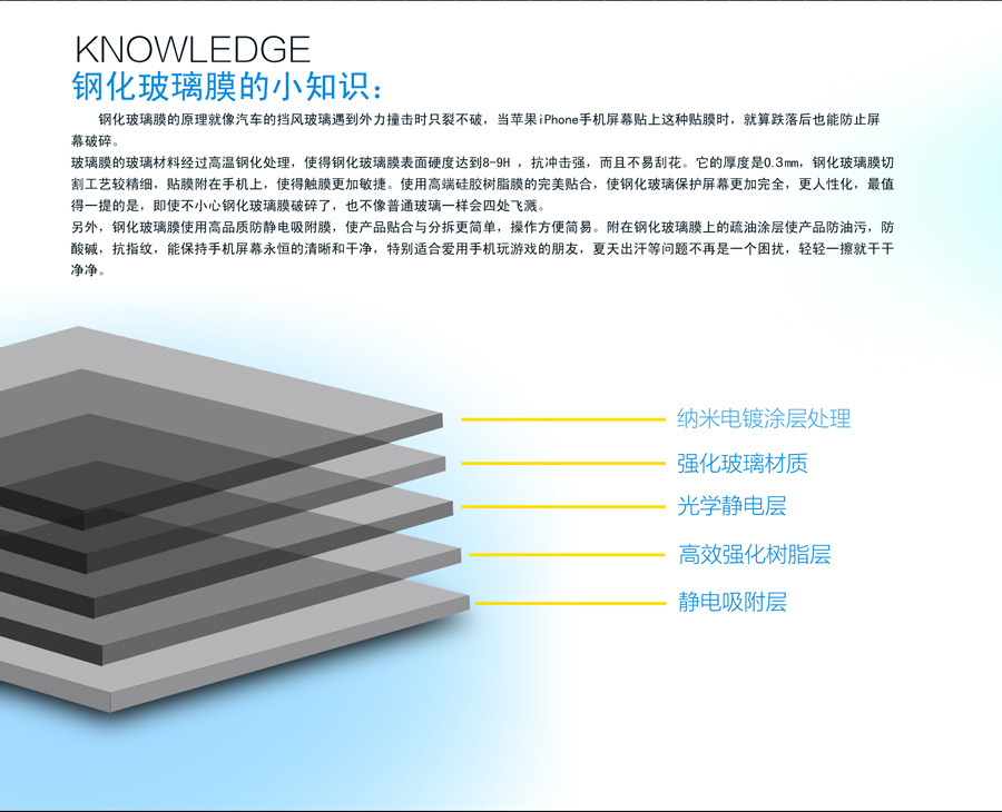 把一般的玻璃沉淀在硝酸鹽(KNO3)大幅度的增加了玻璃表面的密度同時也增加他的強度。密度的增加能提高的防刮能力。2012年在美國推出的鋼化玻璃保護膜,專為Iphone4/iPhone5 ipad 三星系列 而設計的高科技保護膜,是目前對Iphone屏幕強化保護的高端新產品。這種保護層的厚度只有0.5毫米,能將Iphone的屏幕面完全覆蓋,防止受到外力的損害,劃傷外,更增加了沖擊吸收性,比PET膜的標準高5倍。