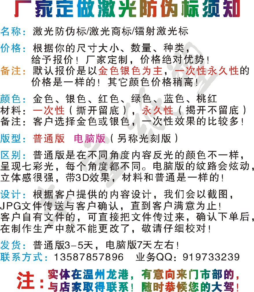 本廠專業制作激光防偽商標、電碼防偽商標、鏤空水洗防偽、不干膠印刷、螢光防對外承接激光制版、加溫變色、易碎紙商標、特種防偽、PET/OPP鐳射膜、透明鐳射膜、絲網印刷、紙盒、包裝袋、無紡布袋、泡泡貼、紋身貼、專定定制等產品專業生產加工的公司,擁有完整、科學的質量管理體系。蒼南縣龍港豐寶紙塑制品廠的誠信、實力和產品質量獲得業..