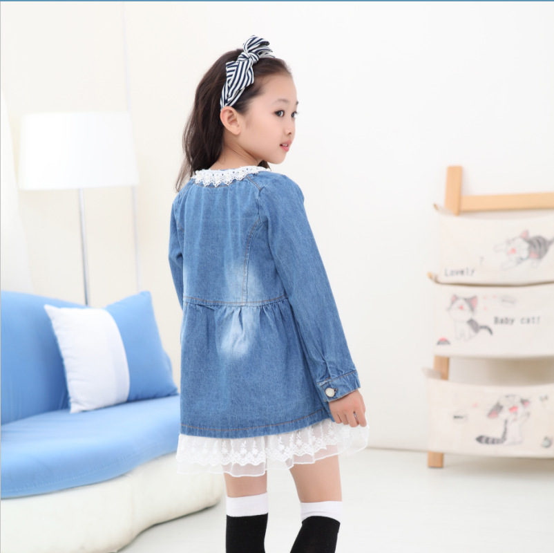 2015春款韓版中小女童牛仔裙長袖蕾絲牛仔紗裙代理加盟一件代發