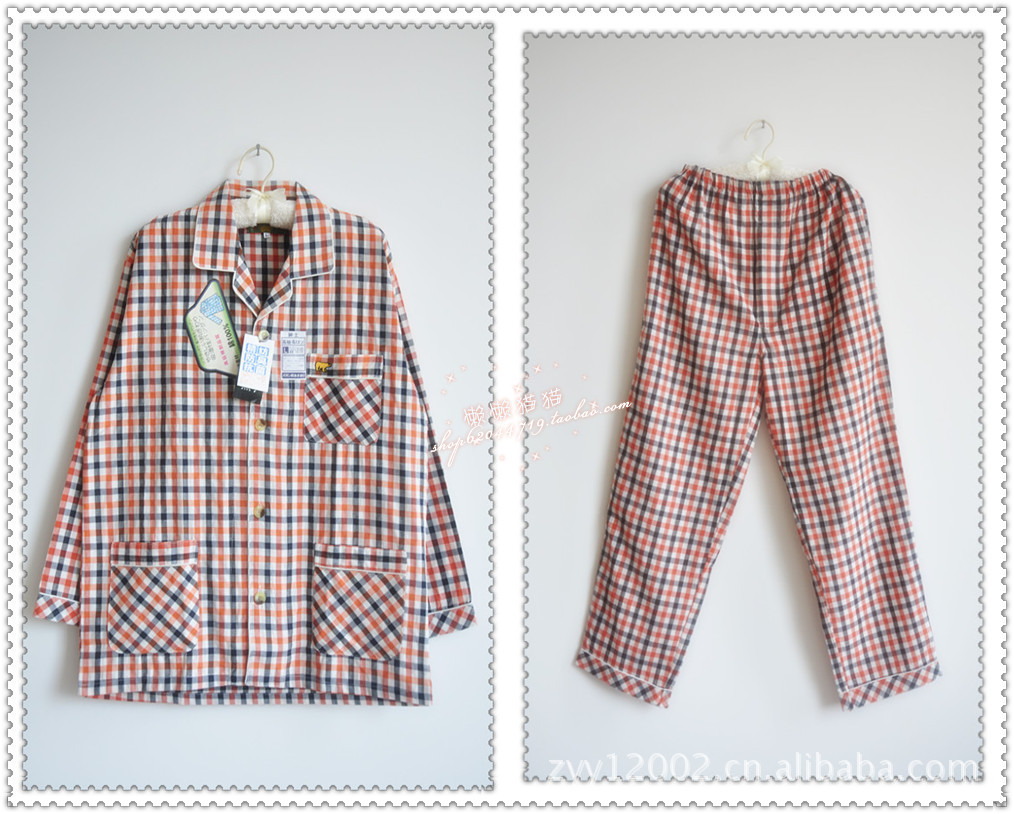 批發零售代發 日系原單外貿男士純棉紅格子長袖睡衣套裝居家服