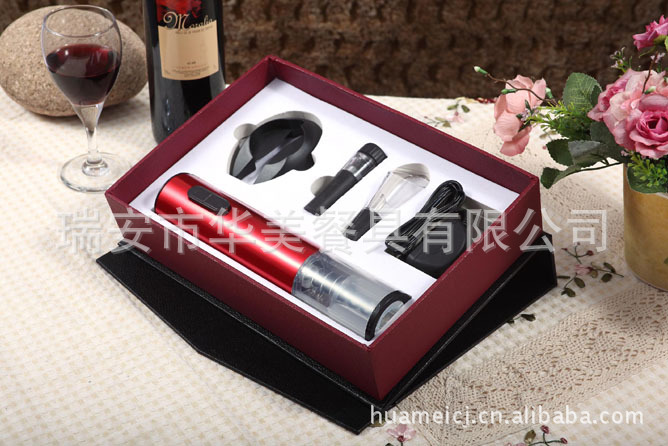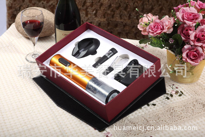 3、充電電動開瓶器套裝配置有充電電動開瓶器、割紙器、真空酒塞、充電器、倒酒器,并配有精美的木皮盒包裝。