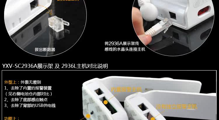 (顏色分類)送2936A版:報警主機*1個 YXV-SC2936A展示架*1套 MicroUSB專用充電線*2 說明書*1份【可選配件】3M膠 / 充電線 / 遙控器 (請參見屏幕上方搭配套餐,購買10套以上贈送一支遙控器)