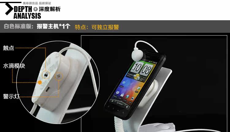 本防盜展示架顧名思意,主要用于手機真機的展示多功能防盜體驗架,當然也適用于電吹風、家電遙控器、剃須刀等小家電的防盜演示。本品由展示架 報警主機 紐扣電池幾部分組成,并自帶充電插口,可選充電功能。在使用過程中根據布防后指示燈亮光狀態,當指示燈發紅光時要記得即時充電,指示燈亮綠光表示正常工作,更多細節請咨詢我們在線客服。