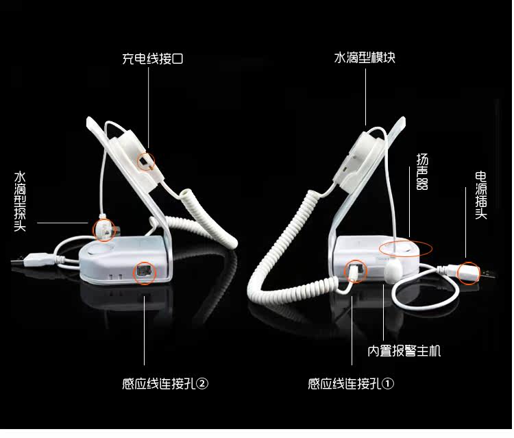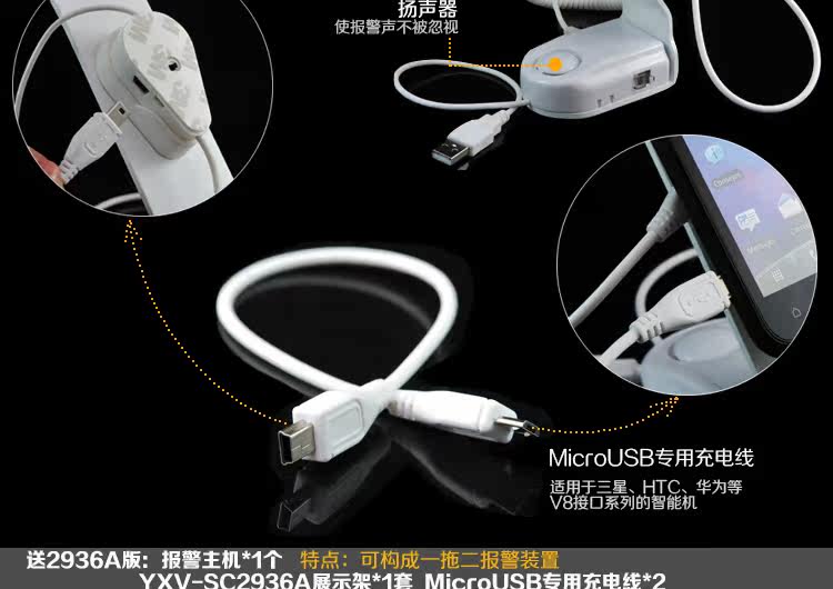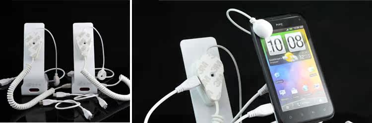 本品的默認的充電線是MicroUSB充電線,iphone系列不適合本防盜展示架的充電款。由于展示架工作時需要耗電,所以親們在使用時要注意及時給展示架充電。