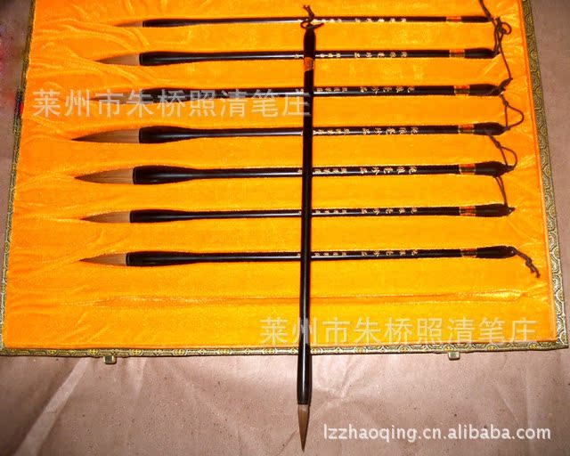 本廠主要生產:狼毫、羊毫、紫毫、兼毫、雞毫、灰鼠毫以及長峰、中峰、短峰、大楷、中楷、小楷,還有特制大提筆、鎮宅筆、高檔珍藏筆、禮品筆共有300多個品種900多個規格。主要用料筆頭以黑龍江省大興安嶺黃鼠狼尾毛、尾須、獾.針、兔影、貉.子毛、羊毛、羊須。筆桿用湖南湘妃、福建烤.紅等名竹以及虹木、紫譚、像牙、景太蘭等。