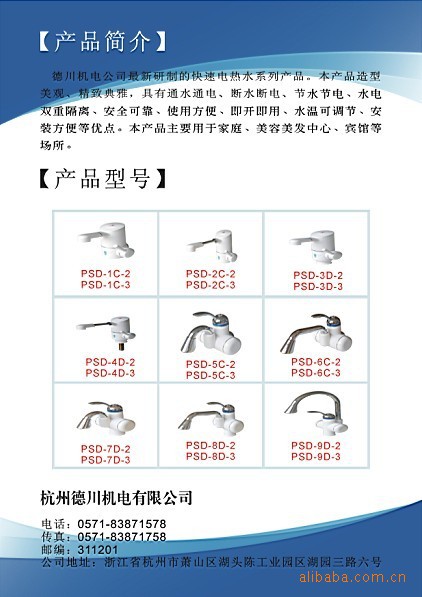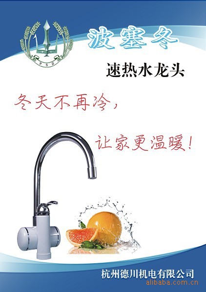 杭州德川機電公司研制的快速電熱水系列產品。本產品造型美觀、精致典雅、具有通水通電、斷水斷電、節水節電、水電雙重隔離、安全可靠、使用方便、即開即用、水溫可調節、安裝方便等優點。本產品主要適用于家庭、美容美發中心、賓館等場所。