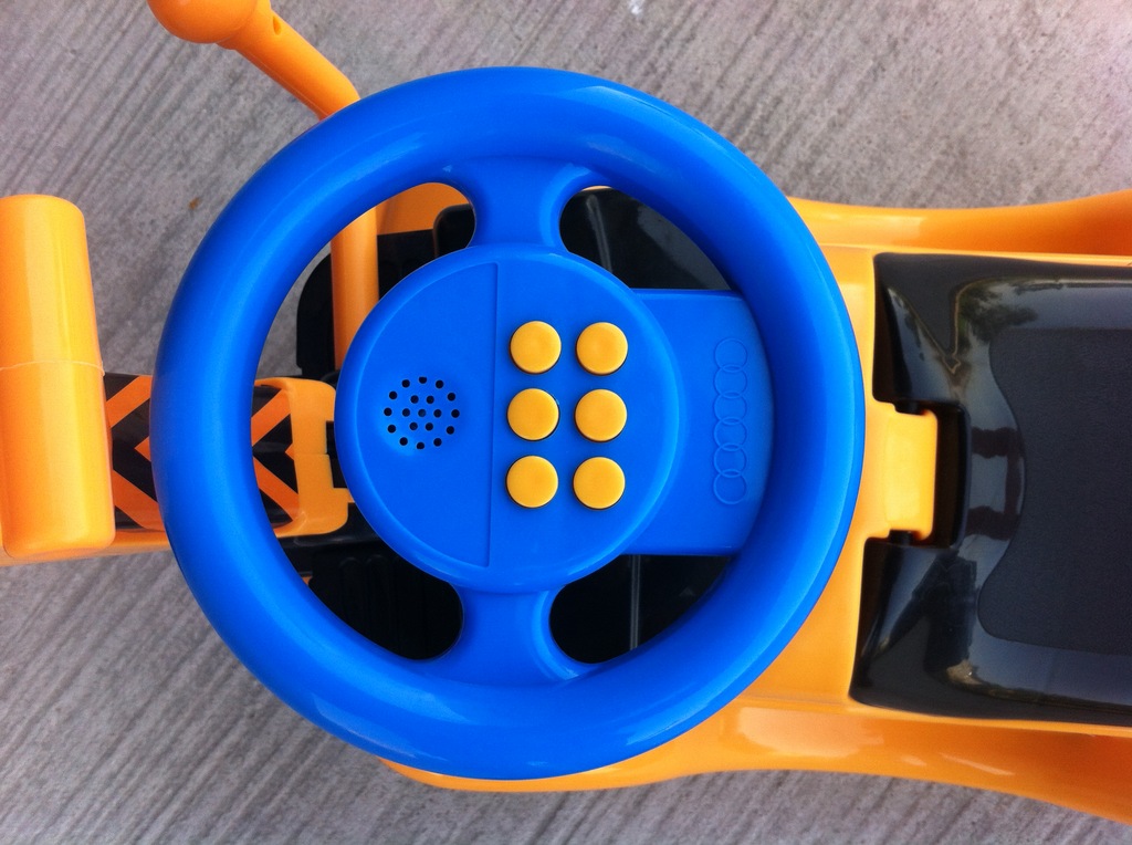 1.寶寶坐在上面可控制放向盤,車頭也會跟著方向盤轉動,小腳動動,車子就會開,請買家注意,不是電動車,要靠寶寶的腳的移動車才會向前開哦。