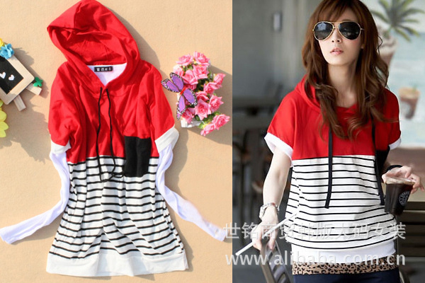YY特色:條紋拼接小T是今年的流行哦!連帽有點小蝙蝠袖的休閑設計