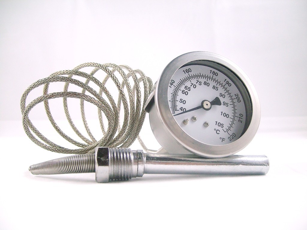 該溫度計的原理是基于密閉測溫系統內蒸發液體的飽和蒸氣壓力和溫度之間的變化關系,而進行溫度測量的。當溫包感受到溫度變化時,密閉系統內飽和蒸氣產生相應的壓力,引起彈性元件曲率的變化,使其自由端產生位移,再由齒輪放大機構把位移變為指示值,這種溫度計具有溫包體積小,反應速度快、靈敏度高、讀數直觀等特點,幾乎集合了玻璃棒溫度計、雙金屬溫度計、氣體壓力溫度計的所有優點,它可以制造成防震、防腐型.
