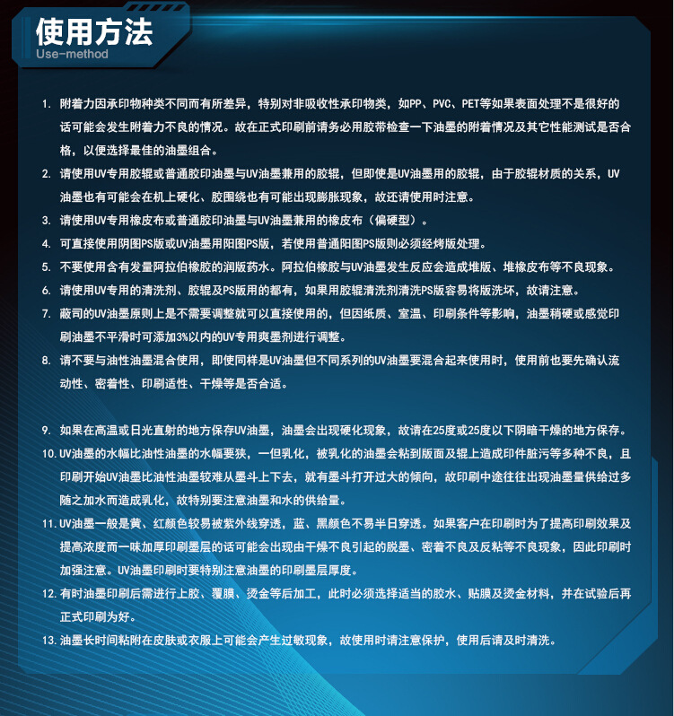 8、請不要與油性油墨混合使用,即使同樣是UV油墨但不同系列的UV油墨要混合起來使用時,使用前也要先確認流動性、密著性、印刷適性、干燥等是否合適。