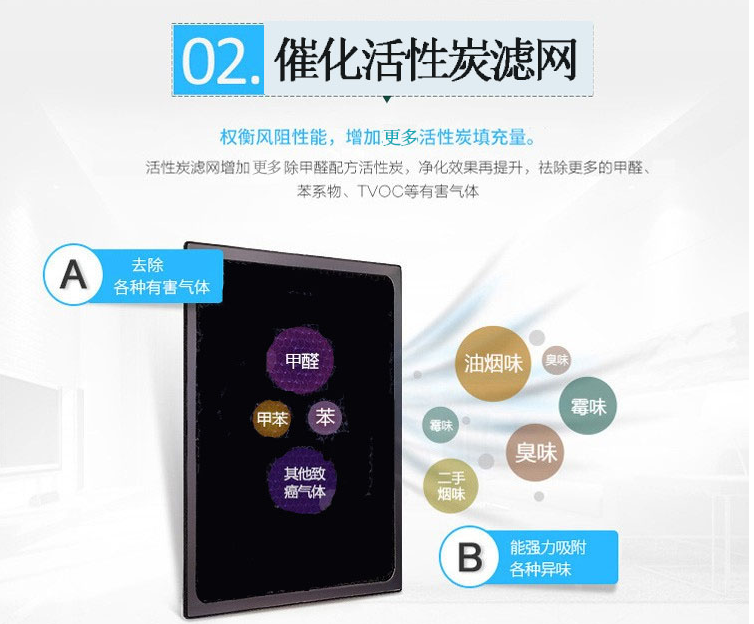 2.催化活性炭濾網,權衡風阻性能,增加更多活性炭填充量?;钚蕴繛V網增加更多除甲醛配方活性炭,凈化效果再提升,祛除更多的甲醛、苯系物、TVOC等有害氣體。