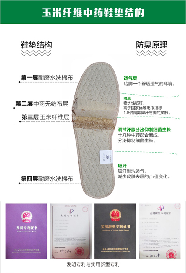 玉米纖維保[jian]鞋墊具有消除腳臭,抑制腳氣,按[mo]吸汗 ,天然草本 ,綠色環保等功效。