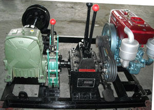 結構與工作原理:1、動力 3T柴油 功率:4馬力 轉速:2600轉/分 5T柴油 功率:8馬力 轉速:2600轉/分 2、傳動方式及變速: 動力與變速齒輪箱3T,A型三角皮帶兩根,5T兩根B型三角皮帶傳動,并裝有傳動離合器。 3、制動 有自動夾剎及離合傳動連鎖剎兩種制動裝置,在正、反方向均起制動作用。 4、手搖裝置: 絞磨機在工作過程中,若遇原發動機發生故障,被吊物在不上不下的情況下,可撥動手搖裝置,將被吊物繼續吊起或放回地面。 5、潤滑方法 變速齒輪箱內各機件滲潤,外軸承用黃油。