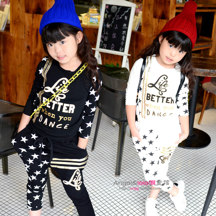 韓版黑色金邊字母星星T恤 星星垮褲休閑套裝 2015春款童裝批發