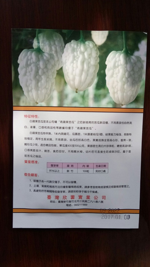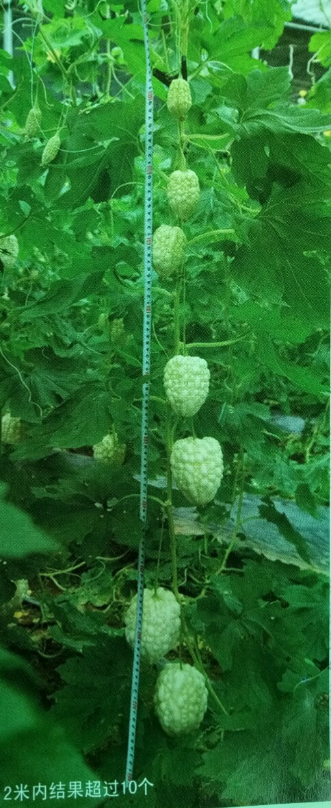 一代交配品種臺灣蘋果苦瓜種子,蘋果型苦瓜,果面密生亮白珍珠粒,糖度高達6度,口感脆甜多汁,果型粗肥,肩形美,早生,生長強健,結果能力強,采收期長,亮麗美觀,單果重500克左右,開花至采收約18天。較抗白粉病和霜霉病,葉綠色,莖稈粗壯,長勢強健,結瓜率高;瓜苦味稍淡、爽脆可口,鮮食、炒食均可。露地栽培產量667平方米最高可達3500kg,大棚栽培產量可達4000kg以上。生長期210~240天,結果期180~210天。 水果苦瓜跟其他的苦瓜 比,它的苦味不那么濃,苦味要淡一點水果苦瓜味道清淡,更適合生食苦瓜個大,而且每個節間都有瓜,這是它與普通苦瓜的不同之處,此外,它生長勢旺,坐果能力強,產量穩定,抗病性好。 蘋果苦瓜營養豐富,所含蛋白質、脂肪、碳水化合物等在瓜類蔬菜中較高,特別是維生素C含量,每百克高達84毫克,約為冬瓜的5倍,黃瓜的14倍,南瓜的21倍,居瓜類之冠。